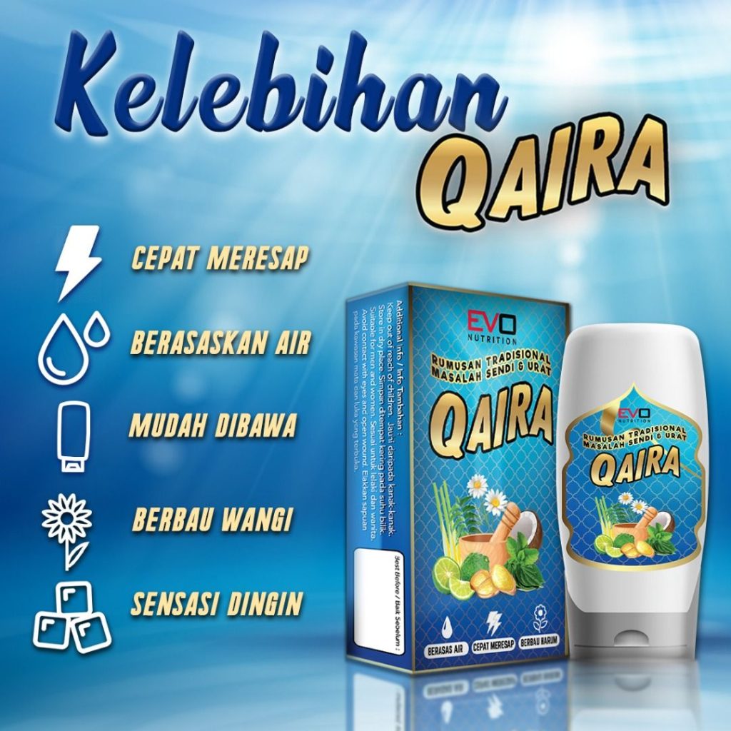 ” Saya sendiri amalkan QAIRA untuk MENGHILANGKAN SAKIT SENDI DAN LENGUH DENGAN SERTA MERTA. Memang bagi tenaga dan sakit lenguh sendi cepat hilang. “